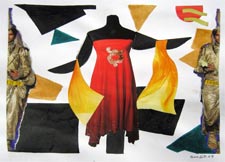 COLLAGE: A collage is a work of art, primarily in the visual arts, made from an assemblage of different forms, thus creating a new whole. An artistic collage may include newspaper clippings, ribbons, bits of colored or hand-made papers, portions of other artwork, photographs, glued to a piece of paper or canvas. The use of collage, however, remained very limited until the 10th century in Japan, when calligraphers began to apply glued paper, using texts on surfaces, when writing their poems. Gold leaf panels started to be applied in Gothic cathedrals around the 15th and 16th centuries. Gemstones and other precious metals were applied to religious images, icons, and also, to coats of arms. The term collage derives from the French "coller" meaning " glue ". This term was coined by both Georges Braque and Pablo Picasso in the beginning of the 20th century when collage became a distinctive part of modern art. |