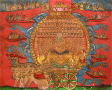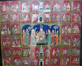 After the painting was completed it was allowed to dry thoroughly. Then a thin paper was placed on top of if and rubbed with a soft smooth stone to enhance the richness in the relief work done with gold foil. In those days artists used vegetable dyes and mineral colors and prepared all the materials they required by themselves. There are numerous examples of mural paintings in temples and palaces in different parts of Karnataka. These paintings are a testament to the rich painting culture of Mysore. The themes of these paintings are largely religious and are taken from the Ramayana and the Mahabharata.